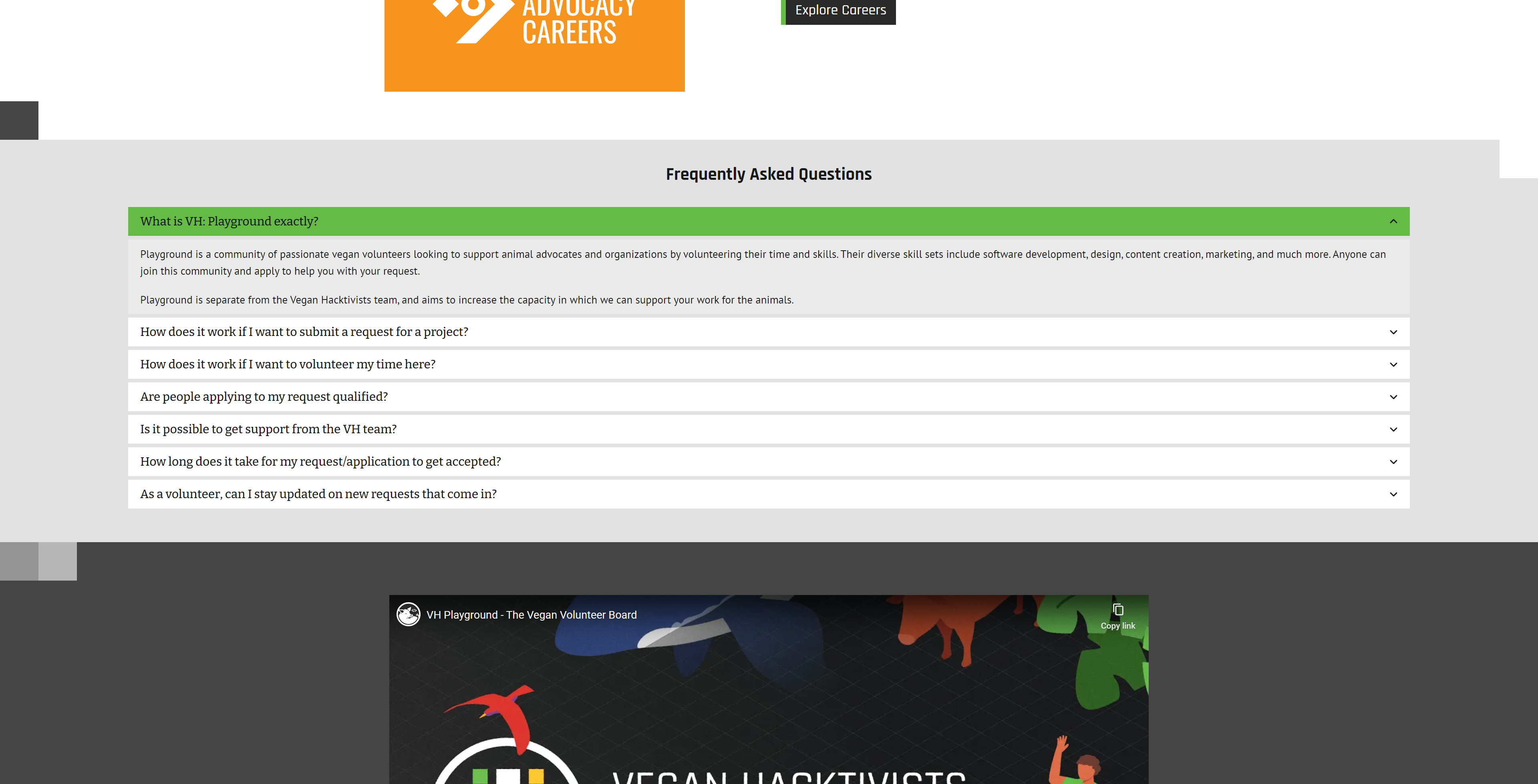 I worked alongside two additional designers to create the landing page for Playground. I split up the workload amongst the three of us and delegated tasks. Our primary goal was to create some new components that matched the brand identity of Vegan Hacktivists, so we designed a new accordion component, form styling, and a card that showcases essential information for each job listing.